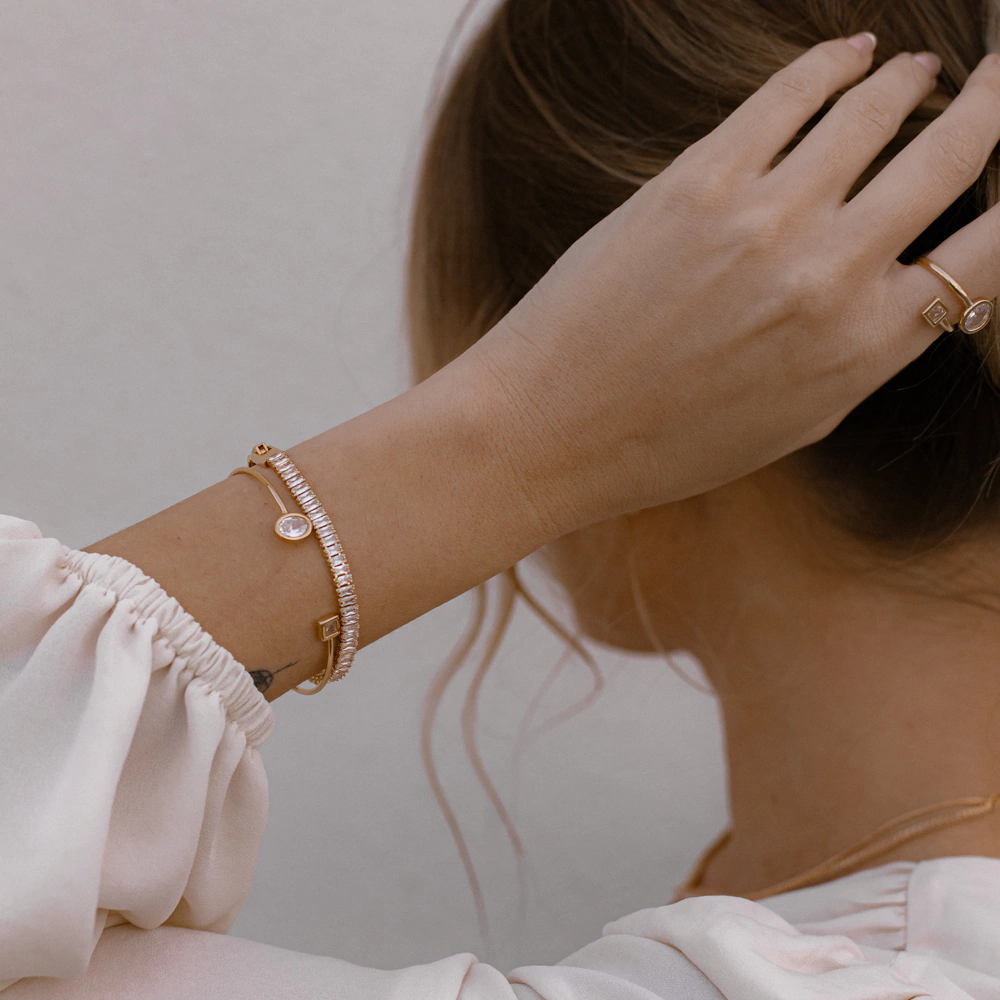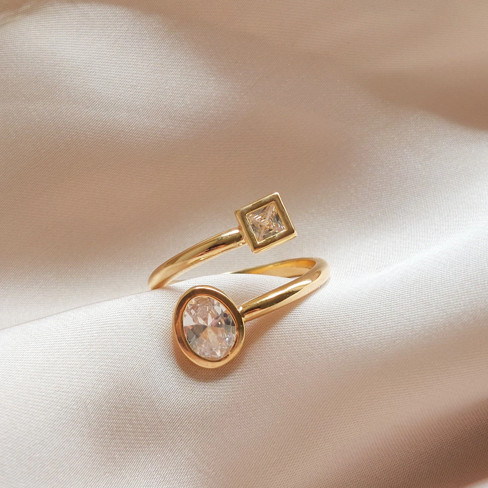 Anel aberto ajustável com zircônias banhado em ouro 18k.